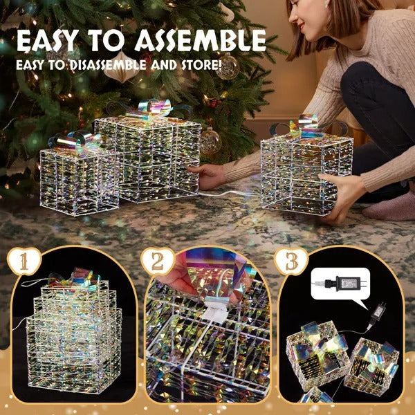 3. Easy Assembly and Storage: Just attach the decorative ribbons, plug them in, and watch them come to life. You can arrange the three boxes in the way you like. Once the holiday season is over, they can be nested inside each other for compact storage.